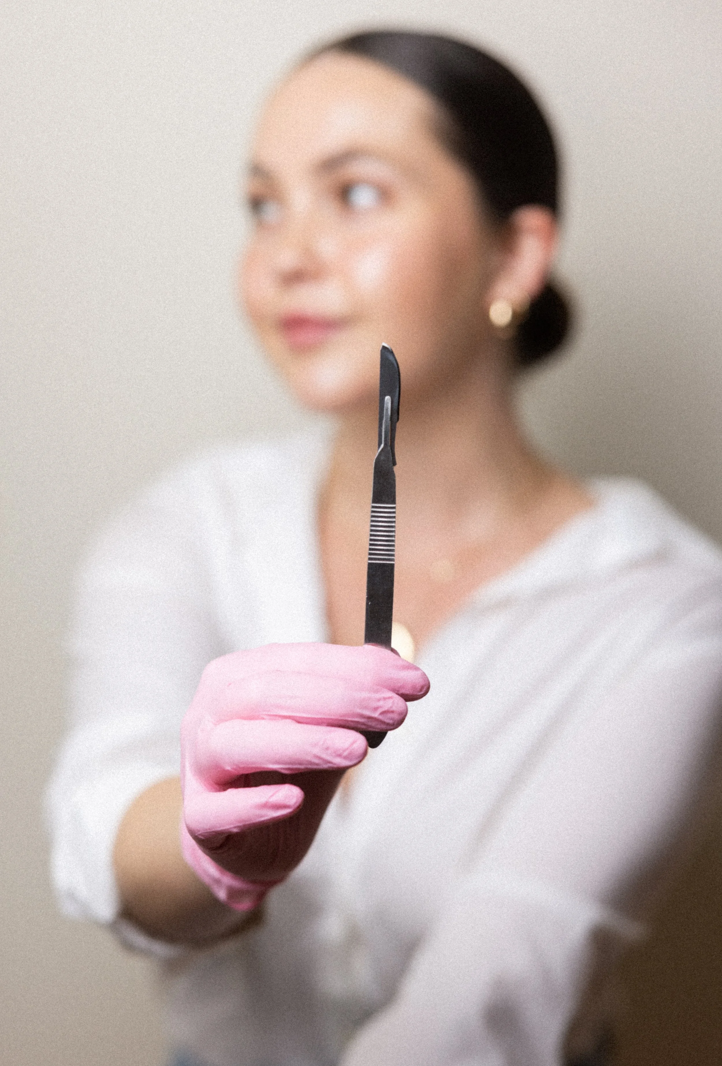 a surgical-grade blade is used at the correct angle and pressure for safe, precise exfoliation.